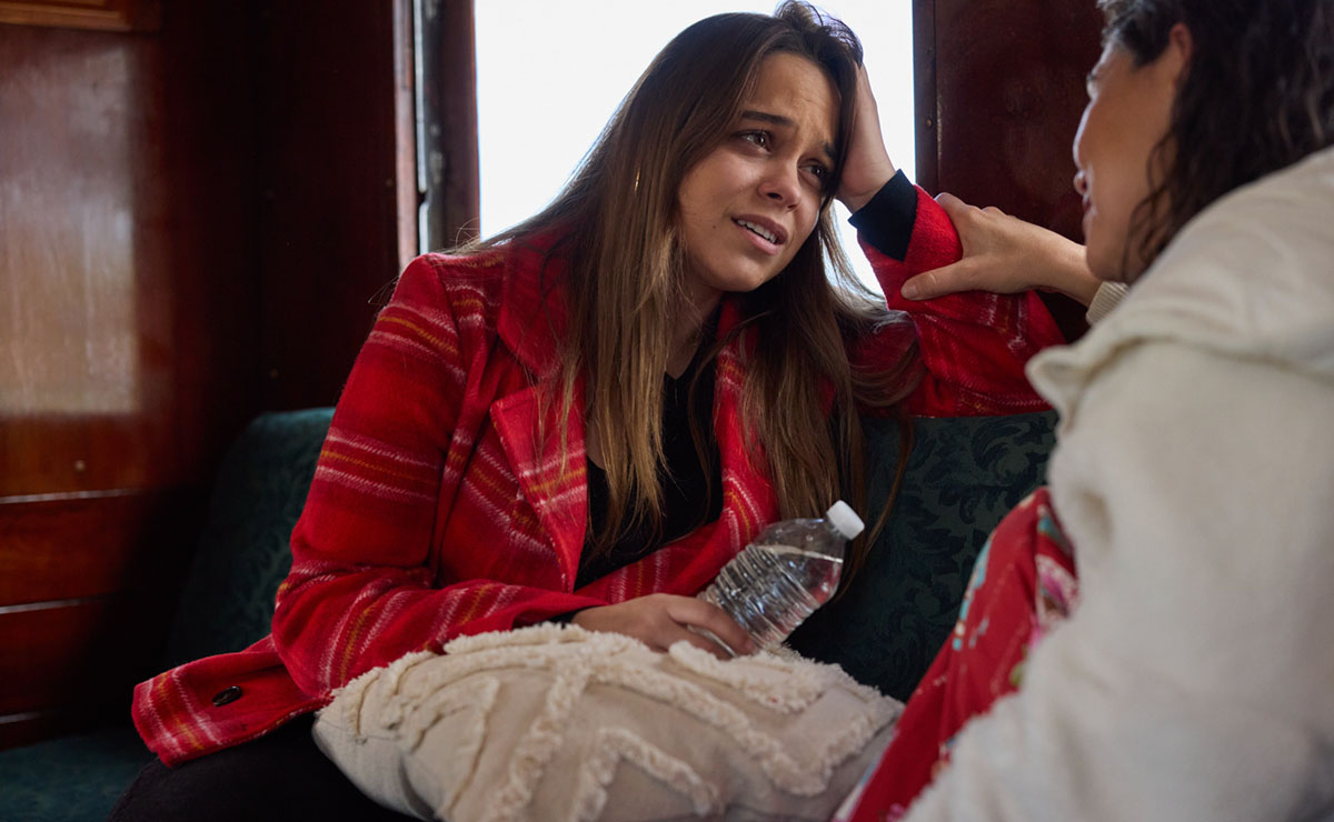 The next morning, spirits are high as the train rolls through the countryside—the only exception being an unexpected and very hungover stowaway, Abby.