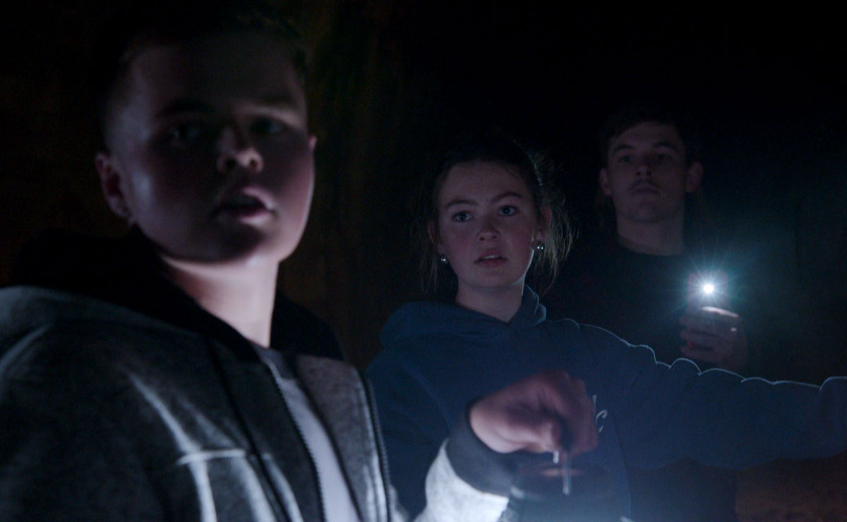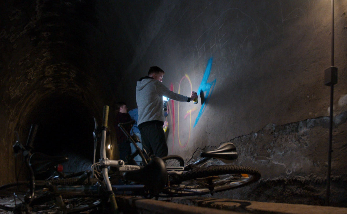 As the party continues, further up the track, a group of teens (Abigail Partridge, Dylan Miller and Kallum Miller) are spraying graffiti on the wall of a narrow tunnel.