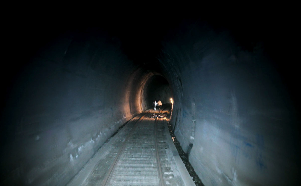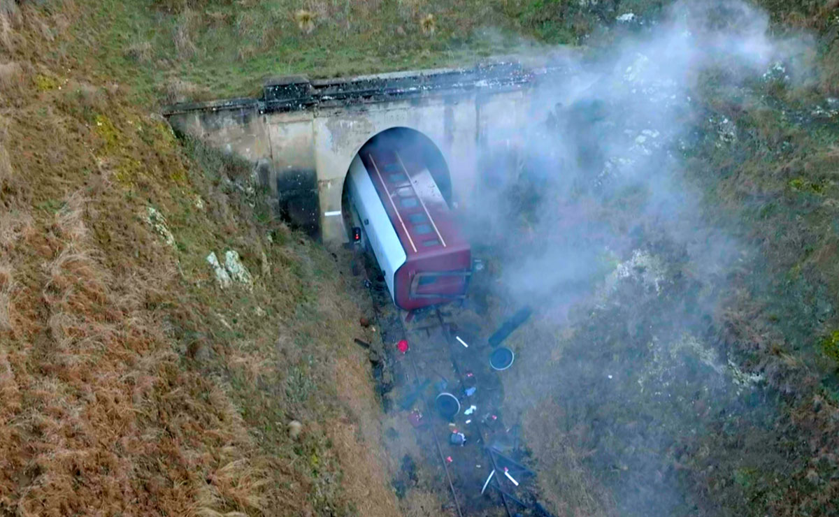 As the engine slams into the tunnel wall, it tips over onto its side, dragging the rest of the train with it!