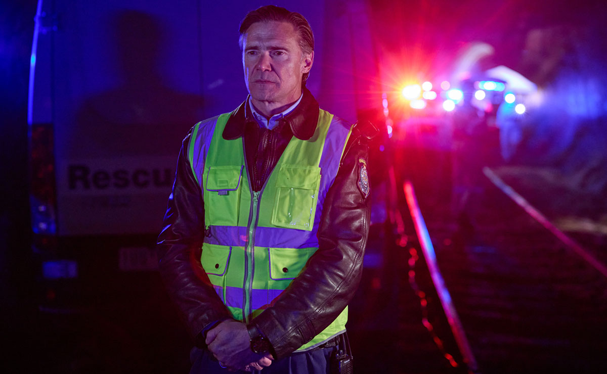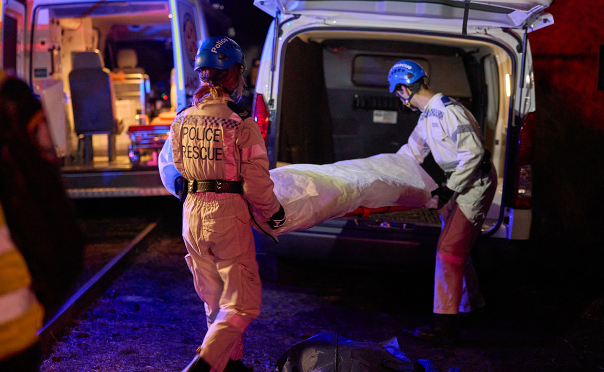 Back at the crash site, darkness falls as David watches four body bags being loaded into the coroner’s van. Cash approaches with pieces of a mangled bike recovered from beneath the engine, explaining that they support the driver’s account that teenagers were on the tracks.