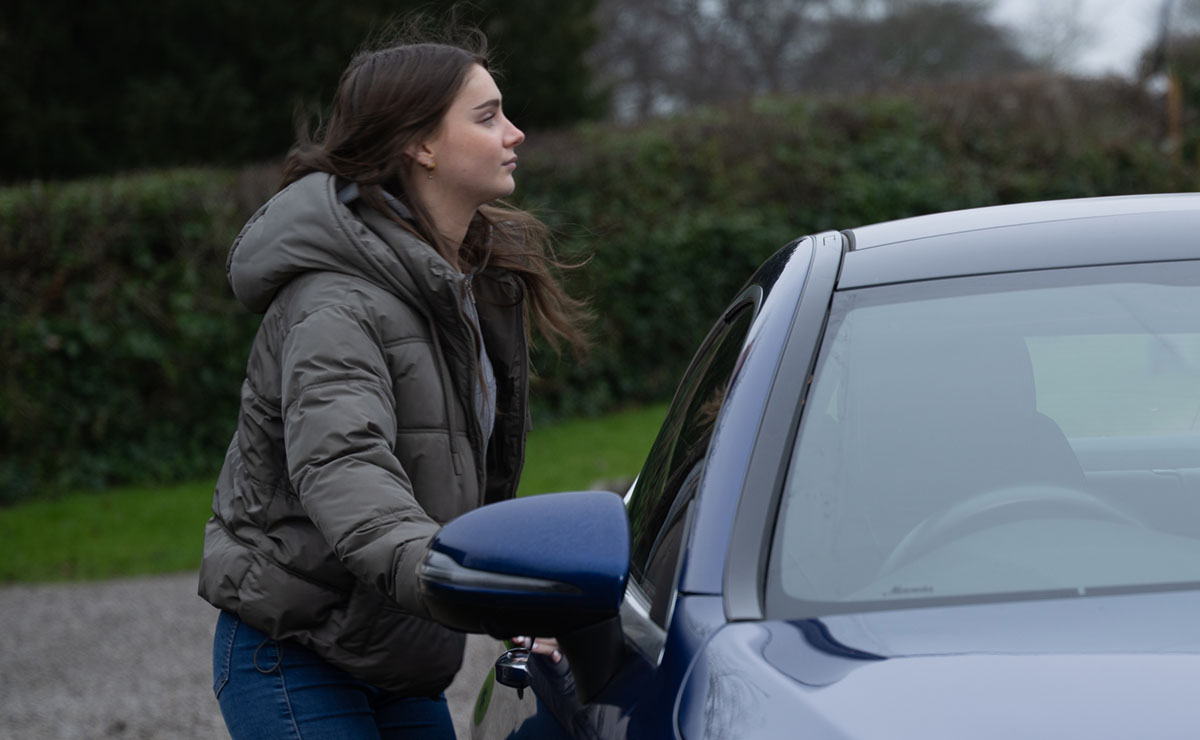 When she spots a sports car parked outside the village hall, she cannot resist temptation and hops into the driver’s seat—only for Jacob to catch her before she can drive off!