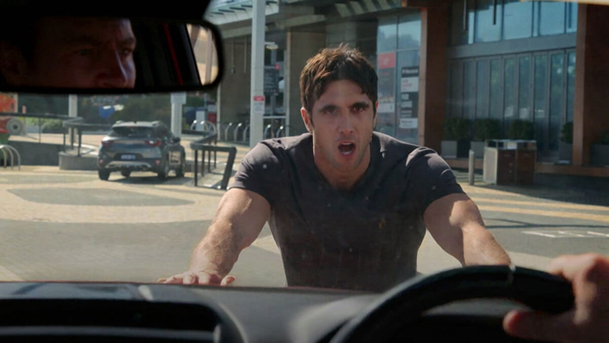 Desperate for help, Tane stands in front of the car, slamming his hands on the bonnet when Brax tries to drive off.