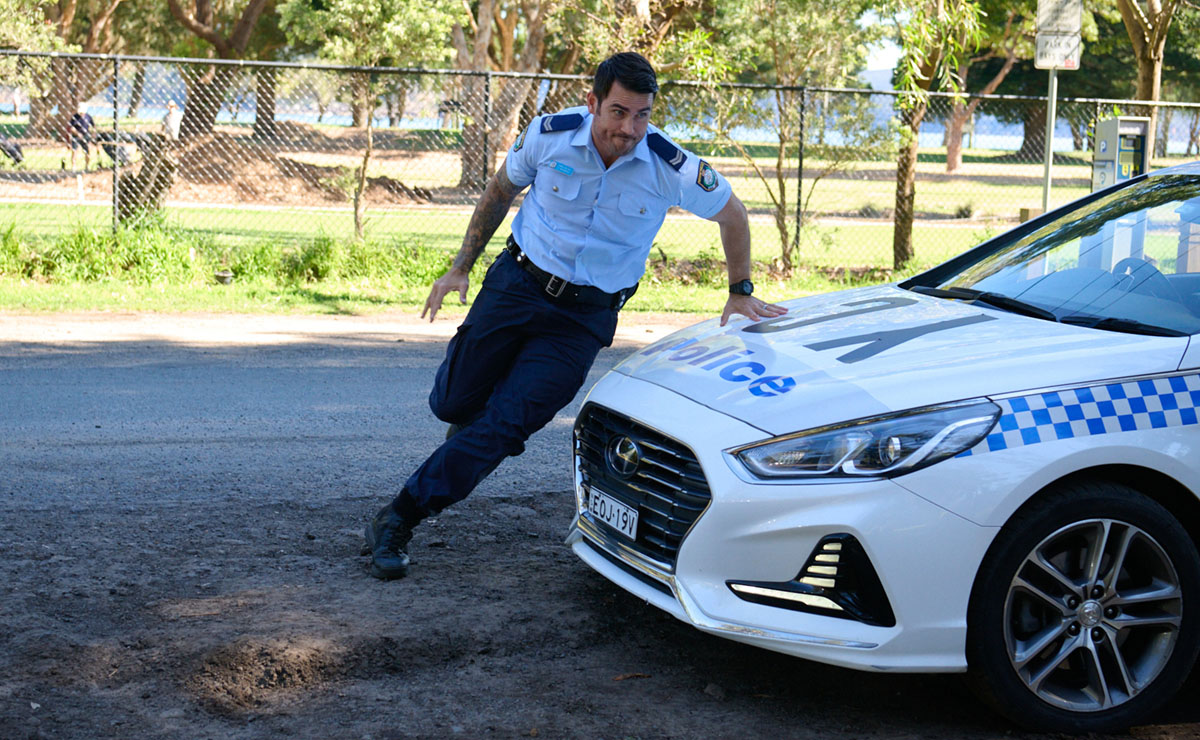 As he makes his way along the road in his patrol car, Cash (Nicholas Cartwright) spots Holden walking across the road.