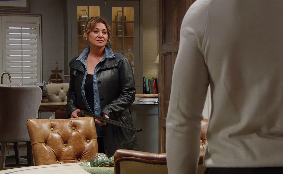 A short while later, Joe’s shocked to be confronted in Home Farm by Moira wielding a shotgun!
