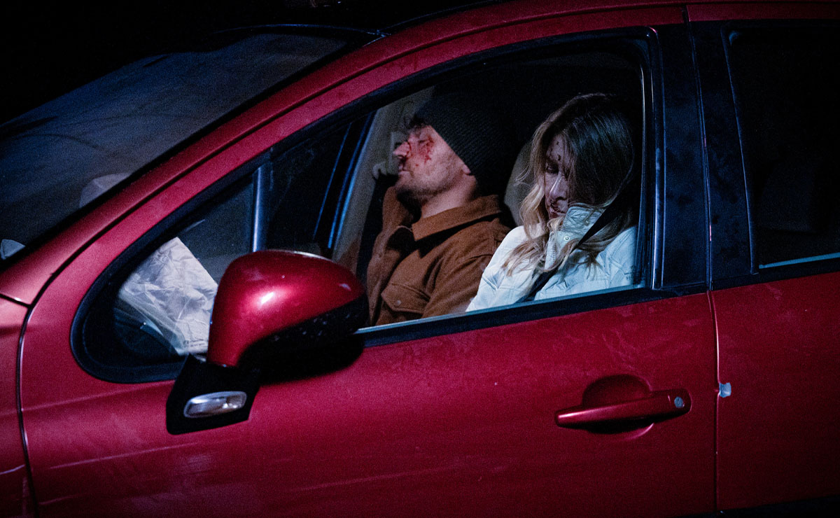 Cain is confused as Mack speeds up from behind flashing his lights, momentarily blinding him, and as they reach the scene of the accident he desperately tries to avert disaster as Mack’s car crashes nearby.